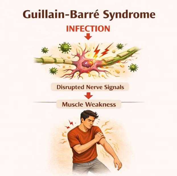 Guillain-Barré Syndrome is a rapid onset of nerve disorder where the immune system attacks the protective covering of nerves called myelin or the nerve fibers themselves. This damage prevents the brain from sending signals to the muscles effectively. It often begins with “pins and needles” in the legs and can spread to the upper body within hours or days.