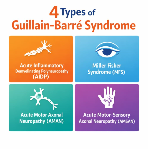 There are 4 types of Guillain-Barré Syndrome that doctors mainly identify which are Acute Inflammatory Demyelinating Polyneuropathy (AIDP), Miller Fisher Syndrome (MFS), Acute Motor Axonal Neuropathy (AMAN) and Acute Motor-Sensory Axonal Neuropathy (AMSAN). It is a frightening paralysis cause, but most people recover with proper medical care.