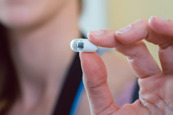 A swallowable, wireless camera capsule that takes thousands of images of the digestive tract, particularly useful for examining the small intestine.