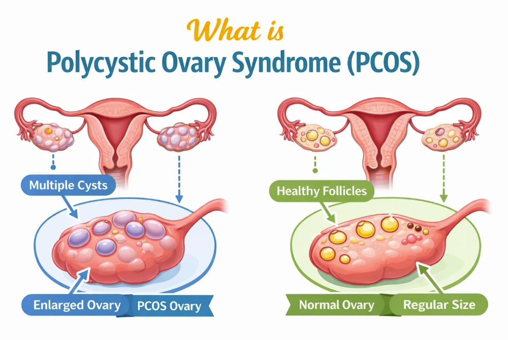 Polycystic Ovary Syndrome (PCOS) is one of the most prevalent hormonal conditions affecting women of reproductive age. It affects not only menstrual health but also skin, metabolism, emotional health, and fertility. Despite being common, many women do not receive a diagnosis because they are unaware of it. PCOS is a hormonal disorder that causes the ovaries to overproduce androgens, or male hormones, which can cause irregular periods, acne, weight gain, and problems with ovulation. Insulin resistance, hormone imbalance, and hereditary factors are the main causes. Blood tests, ultrasound imaging, and symptom assessment are all part of the diagnosis process. PCOS can be successfully treated with medication, medical therapies, and lifestyle modifications, even if there is no long-term solution.